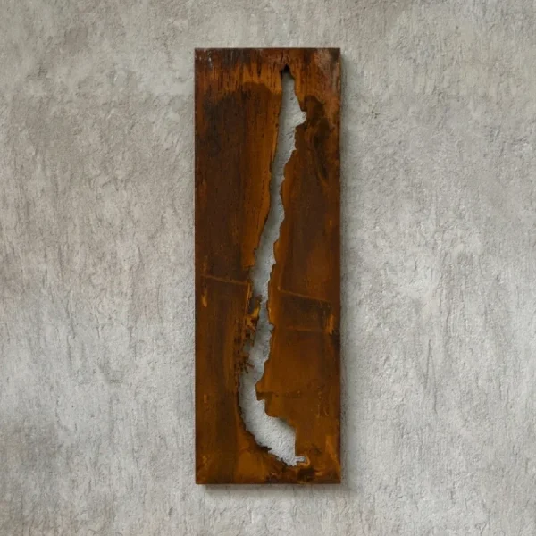 Cuadro decorativo de fierro con la silueta de Chile calada, disponible en terminación negra mate u óxido natural. Estética sobria con identidad territorial. Hecho en Chile.