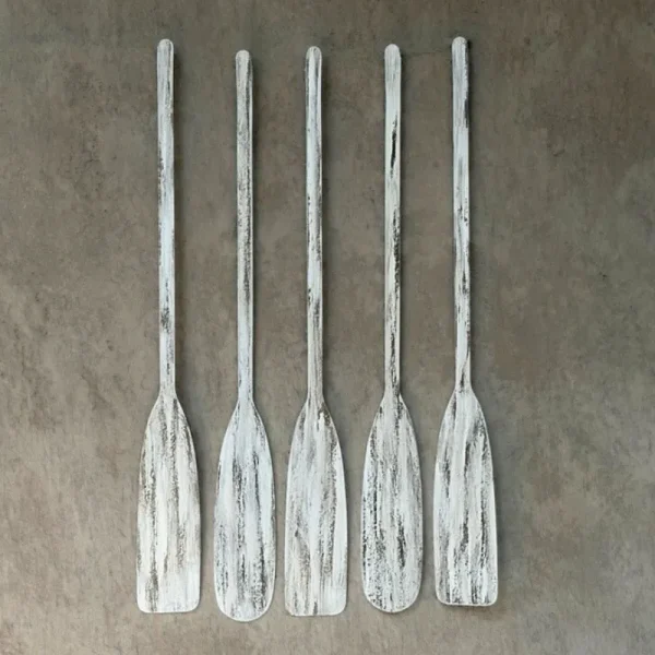Pack de 5 remos decorativos de fierro con acabado en blanco envejecido. Cada pieza ha sido oxidada y pintada a mano para lograr una textura única y auténtica. Miden 1 metro de largo.