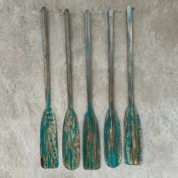 Pack de 5 remos decorativos de fierro con acabado en turquesa envejecido. Cada pieza ha sido oxidada y pintada a mano para lograr una textura única y auténtica. Miden 1 metro de largo.