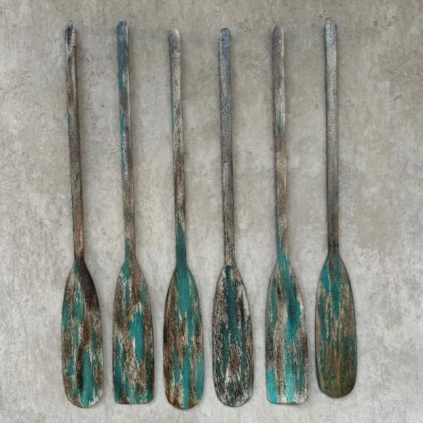 Pack de 6 remos decorativos de fierro con acabado en turquesa envejecido. Cada pieza ha sido oxidada y pintada a mano para lograr una textura única y auténtica. Miden 1 metro de largo.