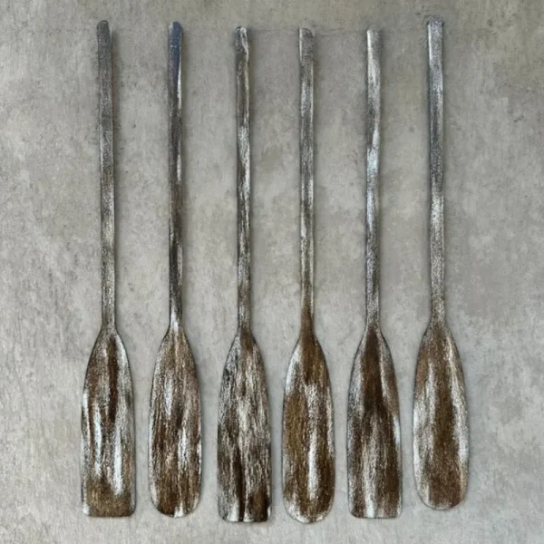 Pack de 6 remos decorativos de fierro con acabado en café con blanco envejecido. Cada pieza ha sido oxidada y pintada a mano para lograr una textura única y auténtica. Miden 1 metro de largo.