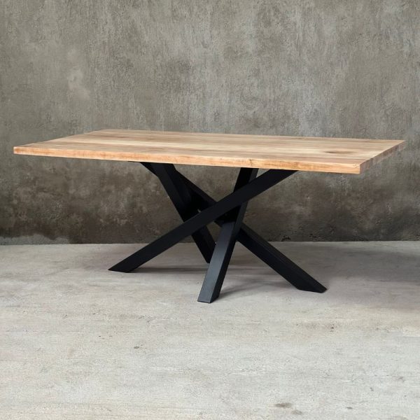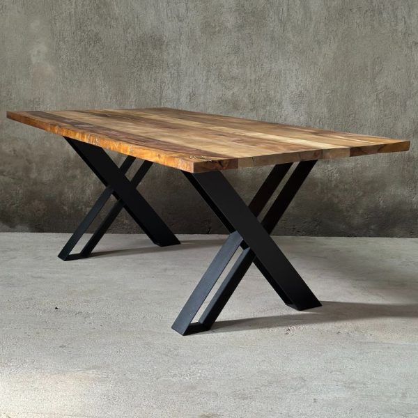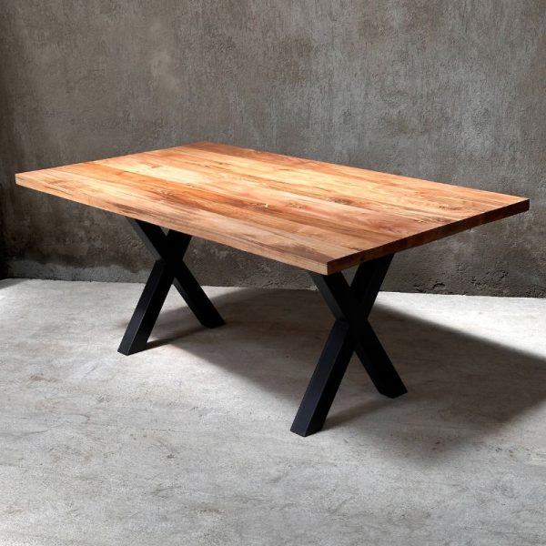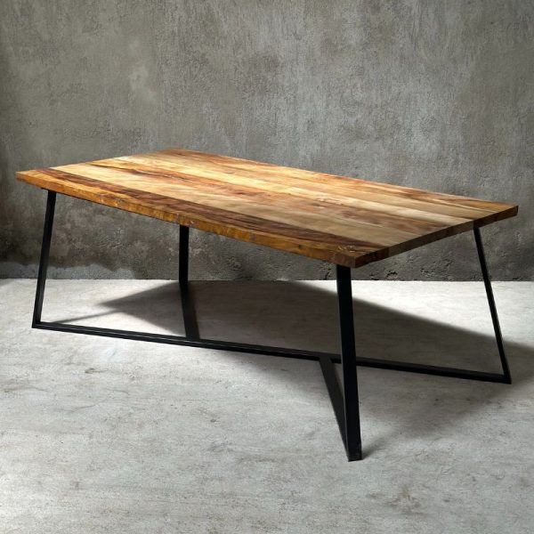 Mesa de comedor con base de fierro y cubierta de madera nativa de 2 pulgadas. Disponible en roble o laurel. Hecha en Chile con terminación de alta resistencia y diseño distintivo.