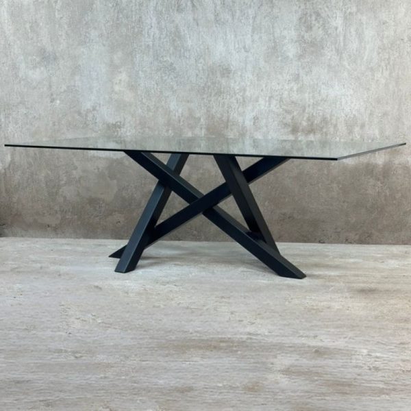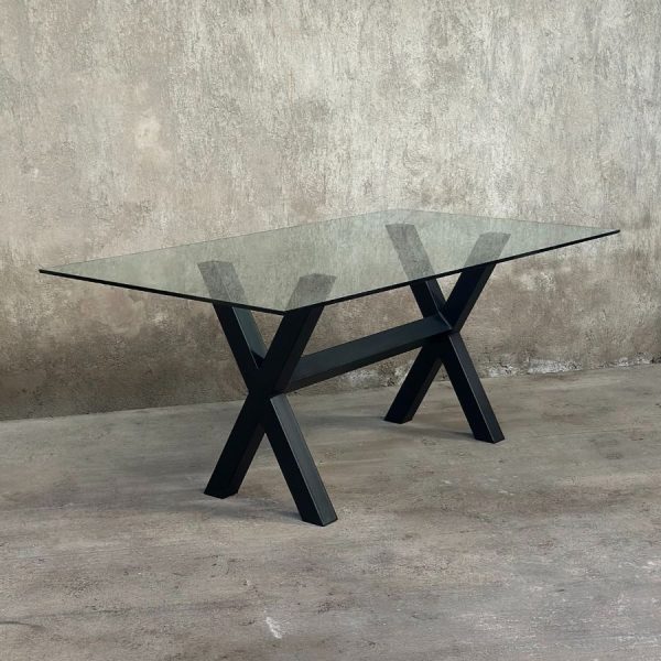 Mesa de comedor con cubierta de vidrio de 12 o 15 mm y base metálica. Diseño moderno con patas entrelazadas y sensación visual liviana. Hecha en Chile.