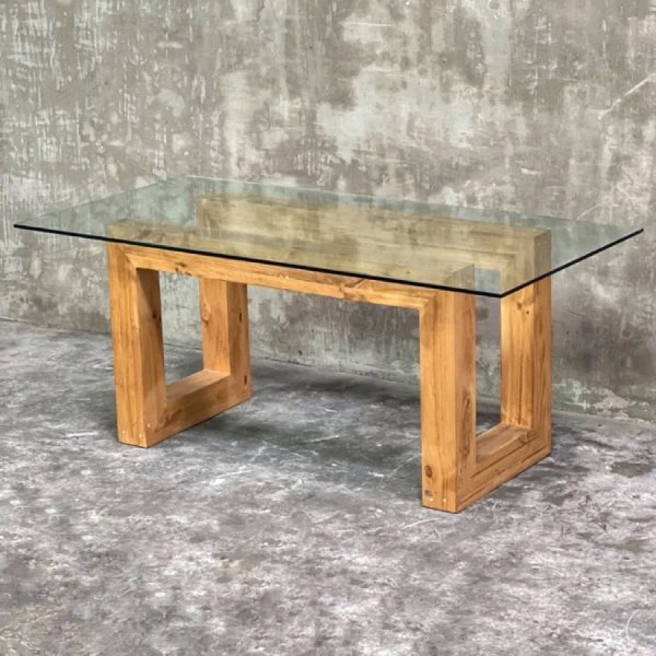 Mesa de comedor con cubierta de vidrio de 12 o 15 mm y base de madera de Pino Radiata. Diseño moderno que aporta amplitud visual y presencia. Hecha en Chile.